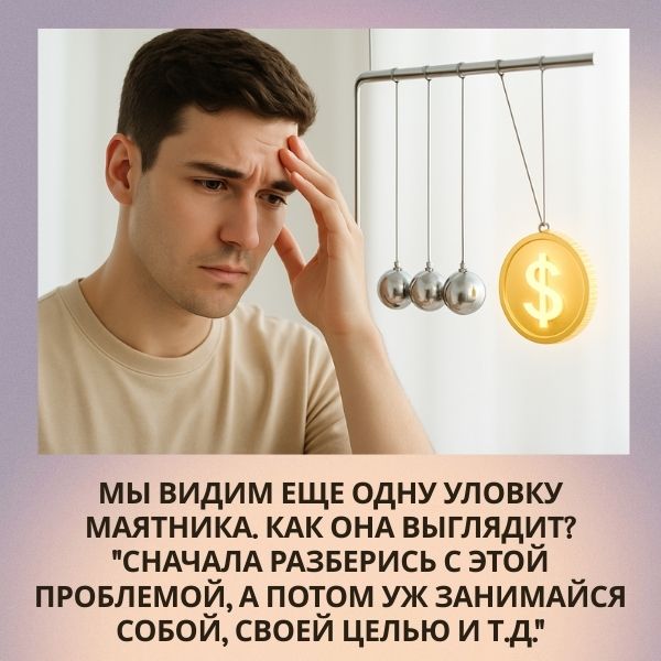 Очень актуальный для многих вопрос, на примере которого мы видим еще одну уловку маятника. Как она выглядит? "Сначала разберись с этой проблемой, а потом уж занимайся собой, своей целью и т.д."