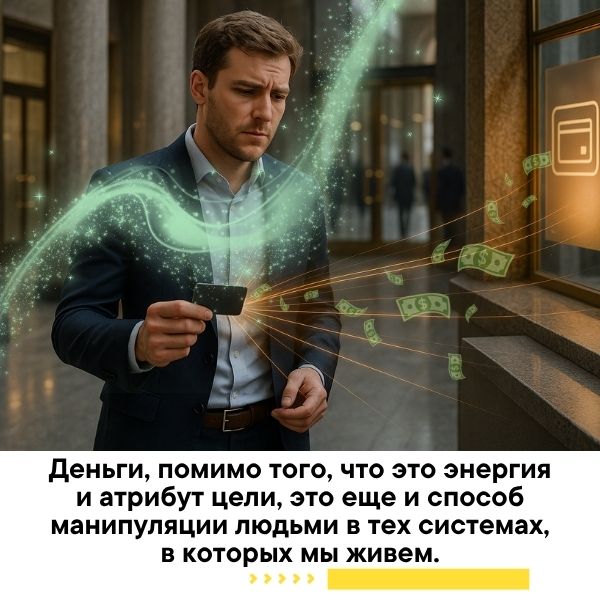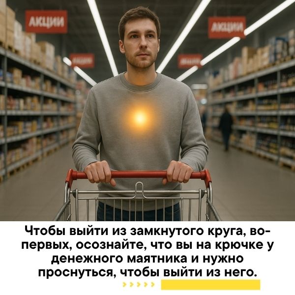 Давайте вспомним, что деньги, помимо того, что это энергия и атрибут цели, это еще и способ манипуляции людьми в тех системах, в которых мы живем. Деньги – мощный маятник, из-под влияния которого довольно сложно выйти, пока вы спите. И вроде бы вы всё понимаете, а сделать ничего не можете, бегаете по замкнутому кругу. В данном случае вам нужно не просто понять это, а осознать. Осознать, что вы находитесь сейчас в ловушке денежного маятника, маятник успешно манипулирует вами.