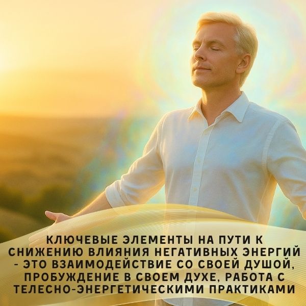 Ключевые элементы на пути к снижению влияния негативных энергий - это взаимодействие со своей Душой, пробуждение в своем Духе, работа с телесно-энергетическими практиками, принятие себя и реальности.