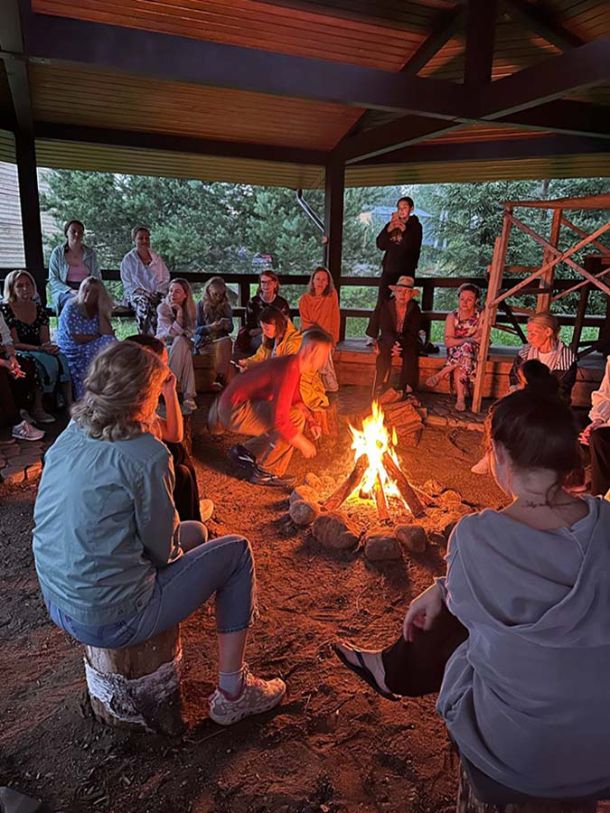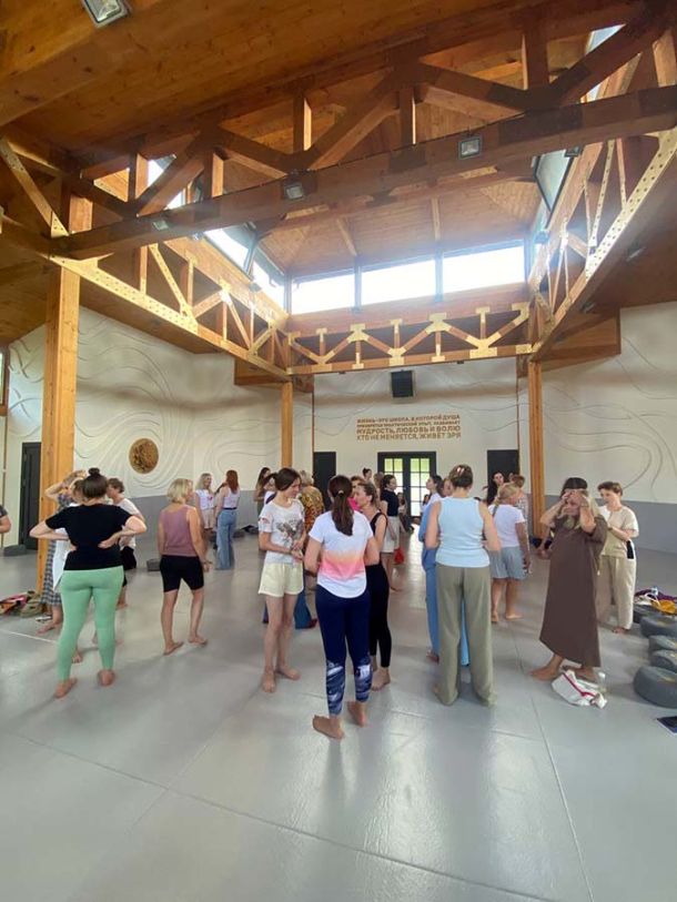 Помимо залов для практик и занятий спортом здесь находятся несколько крытых костровищ и беседок для вечернего общения, а также русская баня, расположенная на берегу озера.