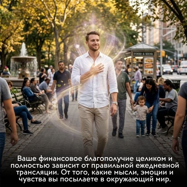 Ваше финансовое благополучие целиком и полностью зависит от правильной ежедневной трансляции. От того, какие мысли, эмоции и чувства вы посылаете в окружающий мир. Транслируете успех и изобилие – и будете жить в достатке. Транслируете тревогу и страх – и будете все время считать деньги и находиться в зависимости от кредитов. Только вы выбираете, в каких энергиях жить: бедности или богатства!