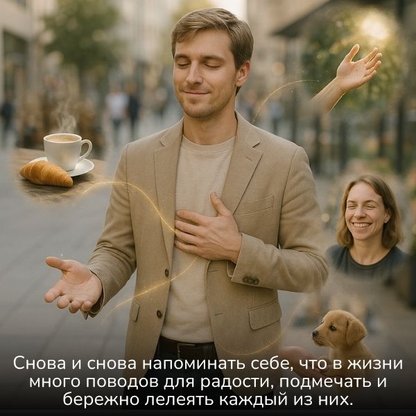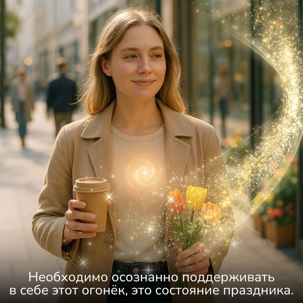 Необходимо осознанно поддерживать в себе этот огонёк, это состояние праздника. Снова и снова напоминать себе, что в жизни много поводов для радости, подмечать и бережно лелеять каждый из них. Возьмите себе за правило каждый вечер записывать по 10, а лучше по 20 пунктов, что хорошего произошло с вами за минувший день, и за что вы благодарны Вселенной. Возможно, сначала эта практика покажется вам трудной, но очень скоро вы без труда будете находить и отмечать по 20-30 пунктов. И тогда внутреннее состояние радости и драйва всё время будет с вами, как бывало в детстве на каникулах, помните? И тогда вы постоянно будете находиться на гребне волны удачи, и за каждым благоприятным событием в вашу жизнь будет входить новое, ещё более красочное.