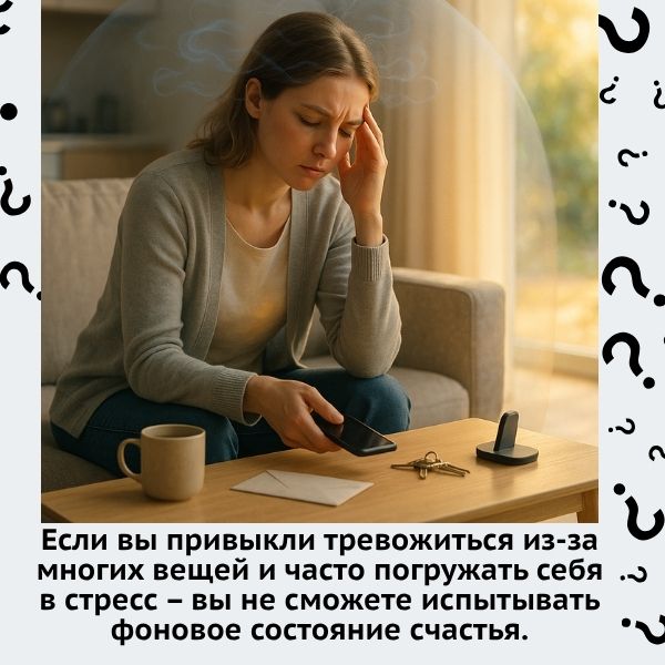 Если вы привыкли тревожиться из-за многих вещей и часто погружать себя в стресс – вы не сможете испытывать фоновое состояние счастья, вас все время будет из него «выбивать». Это как лыжня – когда вы попадаете в нее и катитесь прямо, вам легко и спокойно. Но если вы то и дело сворачиваете в сторону и проваливаетесь в глубокий снег – вы все время будете тратить лишние силы и ресурсы.