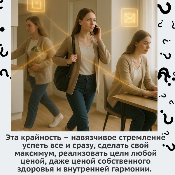 Есть и другая крайность, которая тоже может помешать вам чувствовать себя счастливым и радоваться жизни. Эта крайность – навязчивое стремление успеть все и сразу, сделать свой максимум, реализовать цели любой ценой, даже ценой собственного здоровья и внутренней гармонии.