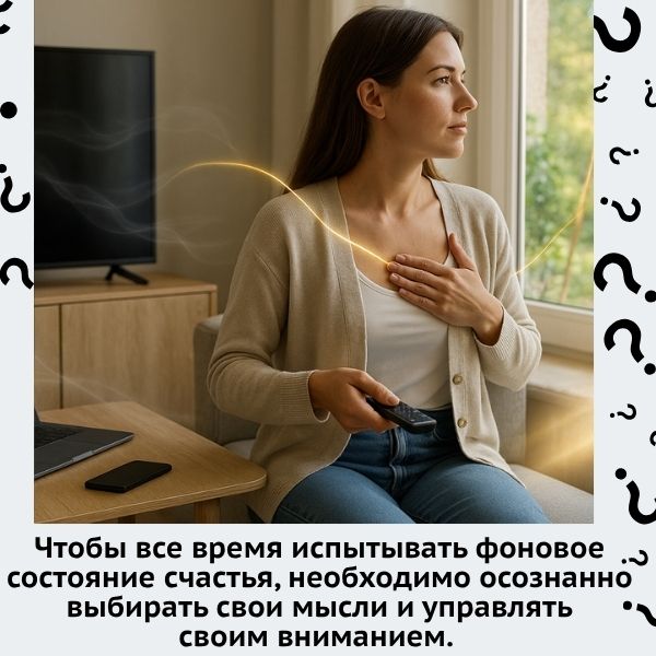 Для того, чтобы все время испытывать фоновое состояние счастья, необходимо осознанно выбирать свои мысли и управлять своим вниманием. В Трансерфинге мы всегда начинаем с тренировки внимания, с того, чтобы научиться возвращать его себе. И, как только мы замечаем, что «уснули» в потоках негативной информации и тревожных новостей – мы перенаправляем свое внимание на что-то ценное и значимое для нас, например, на нашу вдохновляющую цель.