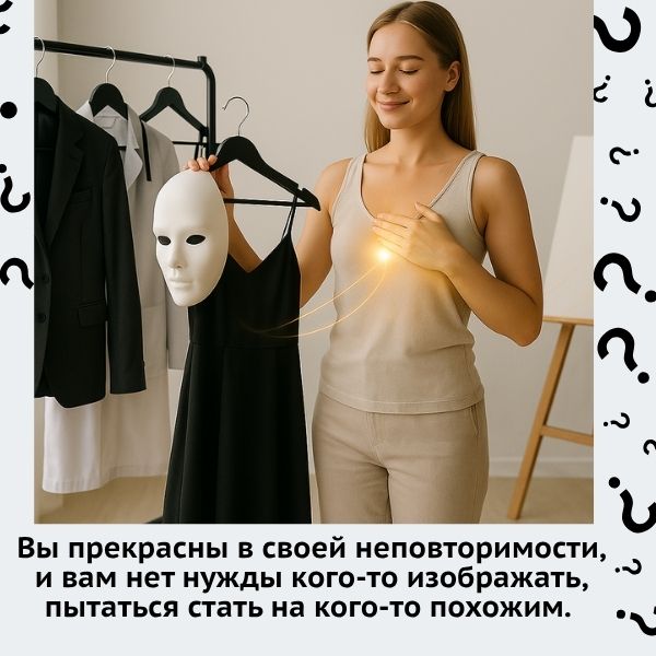 Помните: вы действительно уникальная личность. Так возьмите себе право быть неповторимым, быть индивидуальностью, быть собой. Не сравнивайте себя с другими людьми. Осознайте свою самодостаточность и разрешите себе быть не таким, как все, не пытайтесь соответствовать общепринятым нормам и стандартам. Тогда вы обретете спокойную уверенность в правильности своего пути, внутреннюю гармонию и счастье.