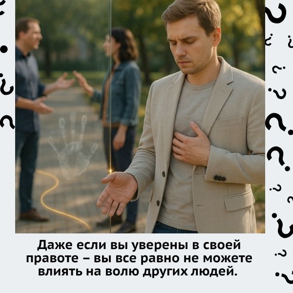 Дело в том, что даже если вы уверены в своей правоте – вы все равно не можете влиять на волю других людей. Каждый человек идет по своему уникальному пути, его Душа получает свой неповторимый, необходимый ей опыт. И до тех пор, пока вы это не примете, пока вы будете продолжать свою «борьбу» с другими людьми – вы не сможете почувствовать себя по-настоящему счастливым.