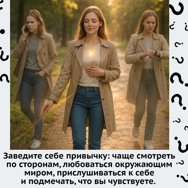 Заведите себе новую привычку: чаще смотреть по сторонам, любоваться окружающим миром, прислушиваться к себе и подмечать, что вы чувствуете. Например, когда вы гуляете по парку, вы не просто шагаете вперед, погруженный в свои мысли. Вы вдыхаете ароматы свежей травы, нежитесь под лучиками солнца или наслаждаетесь влажным после дождя воздухом, наблюдаете за игрой детей, слушаете, как поют птицы, любуетесь цветами или облаками на небе…