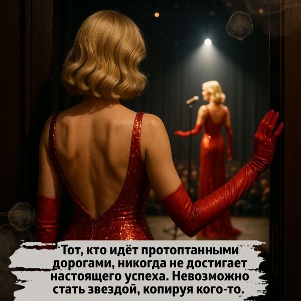 Тот, кто идёт протоптанными дорогами, никогда не достигает настоящего успеха. Невозможно стать звездой, копируя кого-то. В лучшем случае у вас получится пародия, в худшем – вы потеряете себя настоящего, своё собственное «я». Поэтому не ищите для себя кумиров, не подражайте им. Снимите все маски, которые вы привыкли надевать. Позвольте себе роскошь быть собой.
