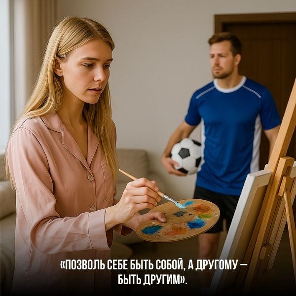 Счастливая в отношениях женщина никогда не растворяется в личном пространстве мужчины, не стремится подчинить его себе и не вторгается на его территорию. Она всегда даёт определенную свободу своему спутнику, потому что сама не зависит от него. У неё есть свои личные цели, желания, интересы и хобби. И, если муж хочет отправиться в поход или в деловую поездку, она с лёгкостью его отпускает, и во время его отсутствия занимается собой: реализует свой список целей, встречается с друзьями и близкими, раскрывает себя в творчестве, занимается саморазвитием и тем, что приносит ей истинную радость и удовольствие, что наполняет её энергией и вдохновением.
