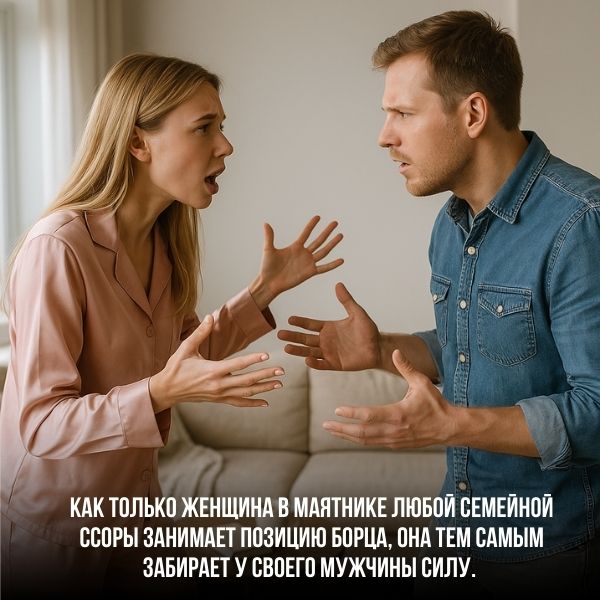 Как только женщина в маятнике любой семейной ссоры занимает позицию борца, она тем самым забирает у своего мужчины силу. Как только она начинает доказывать своему партнёру, что она умнее и лучше него, что она всегда права и всегда знает, как поступить – она лишает себя своей мощной женской энергии, а своего мужчину – силы.