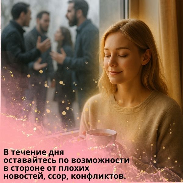 2) В течение дня оставайтесь по возможности в стороне от плохих новостей, ссор, конфликтов. Осознанно переводите фокус вашего внимания с негатива – на ваши цели. Это особенно значимо сейчас, когда наша планета перешла в новое измерение. И Система, увидев, что вы пробуждаетесь и становитесь «ожившим персонажем» со своей силой воли и намерением Вершителя, изо всех сил будет пытаться «вернуть вас на место», втянуть обратно в старый сценарий, поставить в свои рамки.