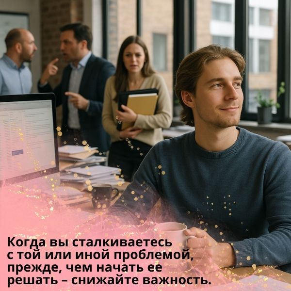 3) Когда вы сталкиваетесь с той или иной проблемой, прежде, чем начать ее решать – снижайте важность. Хорошо, если вам удастся уединиться хотя бы на пять минут, чтобы спокойно подышать, пройтись на свежем воздухе, подумать о чем-нибудь приятным, а уже потом приступать к действиям. Все время напоминайте себе, что именно состояние внутреннего спокойствия, легкости, гармонии и вдохновения формирует вашу реальность, наполненную светом и любовью.