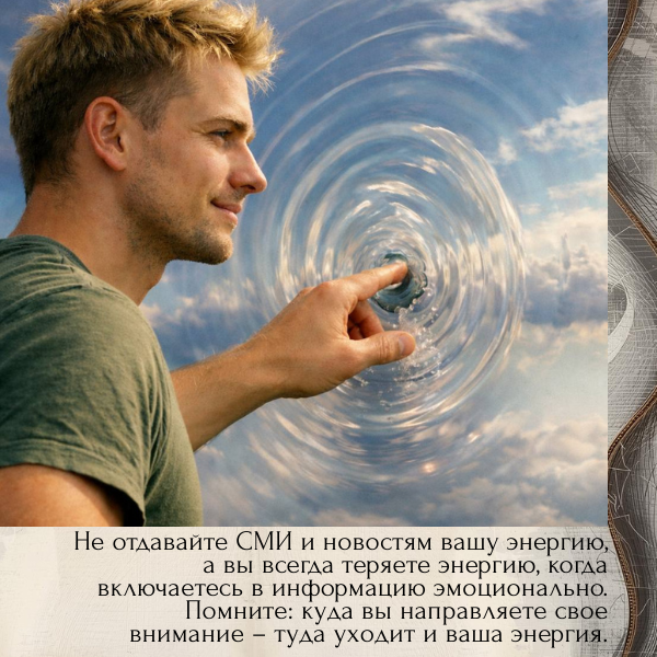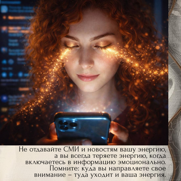 Не отдавайте СМИ и новостям вашу энергию, а вы всегда теряете энергию, когда включаетесь в информацию эмоционально. Помните: куда вы направляете свое внимание – туда уходит и ваша энергия и, как следствие, то вы и получаете в своей жизни.