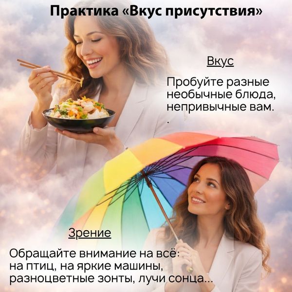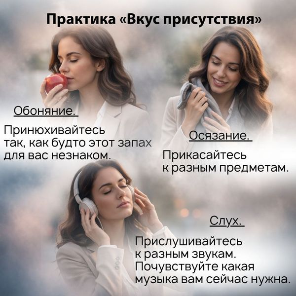 Например, сегодня вы целый день особое внимание уделяете запахам. Вдыхаете, например, запах книги, запаху спелой клубники или яблока, запах вещей, которые вы надеваете на себя. Принюхивайтесь так, как будто этот запах для вас незнаком. Ищите в каждом запахе разные оттенки - ванили, земли, дерева или дождя. Сделайте день наполненным через «Вкус Присутствия».