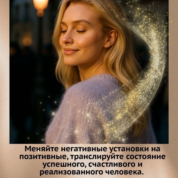 Изменить привычный образ мыслей не всегда удаётся легко и быстро, но нужно к этому стремиться, действуя постепенно. Отслеживайте, чем занята ваша голова в течение дня, меняйте негативные установки на позитивные, транслируйте состояние успешного, счастливого и реализованного человека. Старайтесь при этом не смотреть новости, сократите количество сериалов, не впускайте негативную информацию в ваш слой Мира!