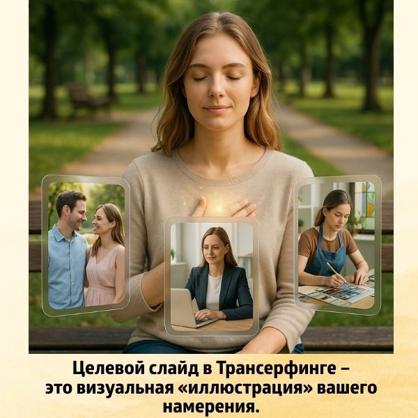 Целевой слайд в Трансерфинге – это визуальная «иллюстрация» вашего намерения. Это, как и намерение, образ уже реализованный цели, только подробный, красочный, со множеством деталей и подробностей. Вы «рисуете» его у себя в мыслях, занимаясь техникой визуализации. Также для своего удобства вы можете записать его на бумаге. Целевой слайд для цели «поиск предназначения» может выглядеть таким образом (только помните – необходимо не просто описывать вашу реализованную цель, но именно представлять всё написанное в красках в своём воображении):