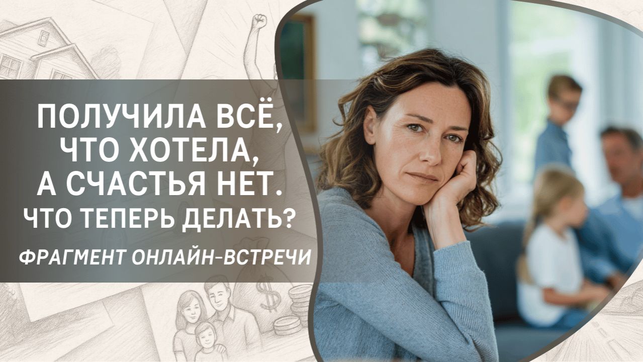 В этом фрагменте бесплатного вебинара Татьяна Самарина отвечает на вопрос участницы: «Я много лет хотела свой дом, жить в нём с мужем в гармонии, работать дома. Замужем не была. Ставила намерение, делала техники: косицу, генератор. Сейчас я переехала в другой город к мужчине, с которым познакомилась в своём родном городе, купила дом. Начальник с предыдущей работы предложил не увольняться, а работать удалённо. Мы делаем ремонт в доме, и вдруг я поняла, что всё не то: не тот мужчина, не та работа (зарплата уменьшилась в 3 раза). Мне очень не хватает близких людей рядом. Вроде бы всё сложилось почти, как я хотела, а счастья нет. Назад пути тоже нет. Как быть в этой ситуации? Есть чувство, что я всё потеряла»