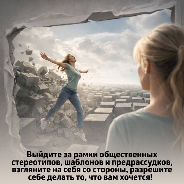 Пока вы живёте по общепринятым канонам: в 17 лет поступить в ВУЗ, в 24 года жениться, в 26 срочно родить детей, к 40 годам во что бы то ни стало обзавестись своей жилплощадью, статусным автомобилем и другими атрибутами роскоши, а в 50 говорить, что вам «уже поздно» – ваше предназначение будет уплывать от вас. Выйдите за рамки общественных стереотипов, шаблонов и предрассудков, взгляните на себя со стороны, разрешите себе делать то, что вам хочется!