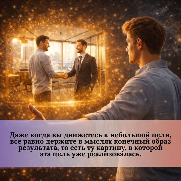 Тем не менее, даже когда вы движетесь к небольшой цели, все равно держите в мыслях конечный образ результата, то есть ту картину, в которой эта цель уже реализовалась.