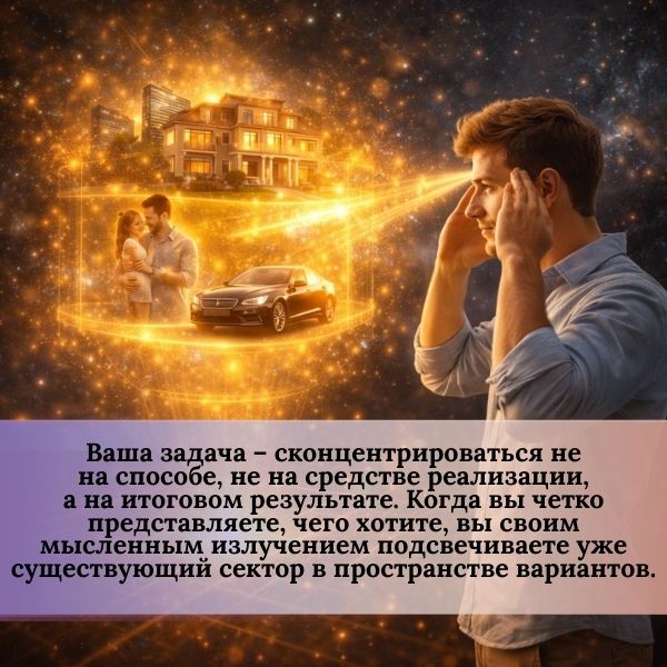 Ваша задача – сконцентрироваться не на способе, не на средстве реализации, а на итоговом результате. Когда вы четко представляете, чего хотите, вы своим мысленным излучением подсвечиваете уже существующий сектор в пространстве вариантов. Так формируется ваша цель и ваша реальность.