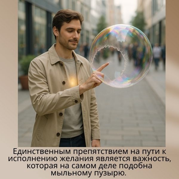 Наши проблемы, в большинстве случаев вовсе не такие «страшные», как мы привыкли их воспринимать. Увидеть реальное положение вещей мешает наш «сон» и личная вовлеченность в ситуацию. Единственным препятствием на пути к исполнению желания является важность, которая на самом деле подобна мыльному пузырю. Осознайте, что проблема иллюзорна. И вы сможете снижать важность во всех ситуациях, которые лишают покоя. Обращаем ваше внимание: не принижать её значимость, а снижать. Посмотрите на ситуацию и на себя в ней беспристрастно, как бы со стороны. Это поможет вам растождествиться с ней и увидеть реальное положение вещей. Когда вы посмотрите на проблему «сверху» и сбросите важность, вы сразу обретете здоровое равновесие. Это не означает, что нужно превратиться в бездушную личность. Просто заботьтесь, не беспокоясь и спокойно делайте то, что следует для решения проблемы.