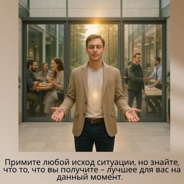 Позволить себе принять любой исход ситуации. Не очень-то хочется, правда? Ведь мы рассчитываем на положительный результат, когда идём, например, на собеседование или на свидание. Страхи и завышенная важность – это не что иное, как недоверие ко Вселенной. Если же вы доверяете, то знаете, что результат, который вы получите – лучший для вас на данный момент. Если вас сейчас постигла неудача, то только для того, чтобы вы смогли увидеть другой вариант – действительно нужный вам. Когда понимание этого находится в вас на уровне внутреннего знания – растворяются избыточные потенциалы и все решается «само собой».