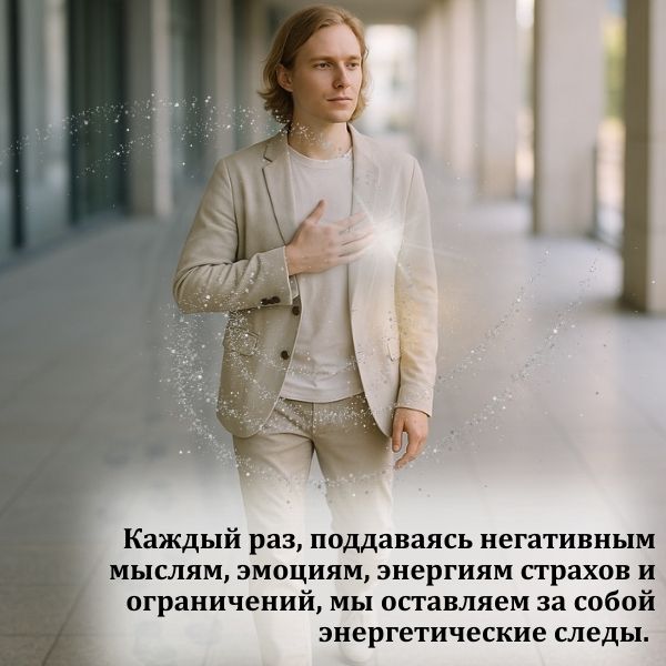 Осознайте: все, что мы транслируем вовне – это энергия, которая никуда не исчезает. Каждый раз, поддаваясь негативным мыслям, эмоциям, энергиям страхов и ограничений, мы оставляем за собой энергетические следы. Они никуда не исчезают, остаются на карте нашей жизни как темные маркеры того, как мы жили и что испытывали, прежде чем познакомились с Трансерфингом.