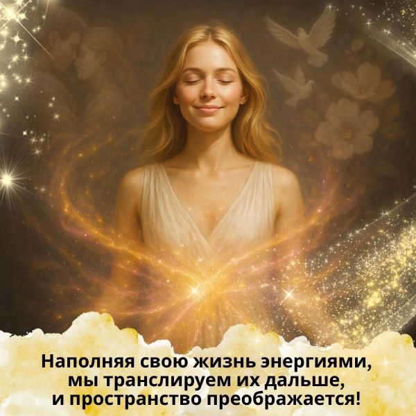 Милые женщины, я считаю, что от нас с вами зависит очень многое. Представьте, что было бы, если бы все женщины в мире были бы счастливы, излучали энергию любви, радости… Как преобразился бы наш мир! Наполняя свою жизнь этими энергиями, мы транслируем их дальше, и пространство преображается!