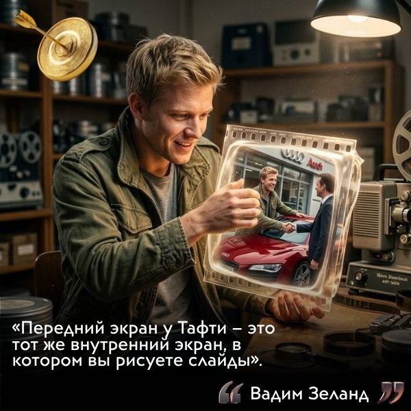 Ответ: Ничего подобного у Тафти не сказано, что надо наблюдать себя со стороны. Наоборот, подчёркивается обратное – вы должны быть внутри кадра. Передний экран у Тафти – это тот же внутренний экран, в котором вы рисуете слайды. Передним он назван в противоположность косице, которая позади. Рисуя кадр на переднем (внутреннем) экране, вы должны быть внутри него.