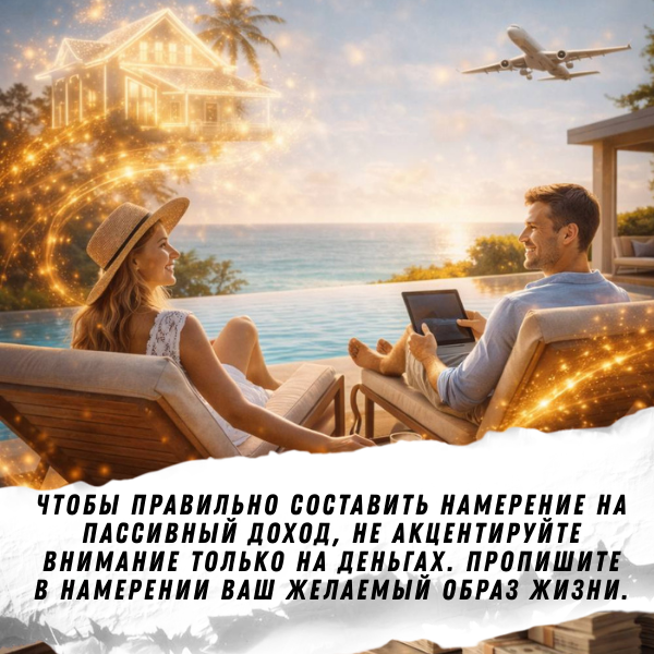 Для того, чтобы правильно составить намерение на пассивный доход, не акцентируйте внимание только на деньгах. Пропишите в намерении ваш желаемый образ жизни: чем вы занимаетесь, как проводите свои дни, куда ездите отдыхать. Описывайте все те моменты, которые значимы для вас.