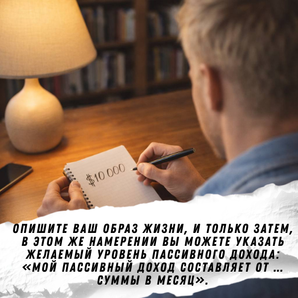 Можно написать, чем вы еще занимаетесь, как вы живете, как часто путешествуете – все, что для вас имеет ценность. Опишите ваш образ жизни, и только затем, в этом же намерении вы можете указать желаемый уровень пассивного дохода: «Мой пассивный доход составляет от … суммы в месяц».