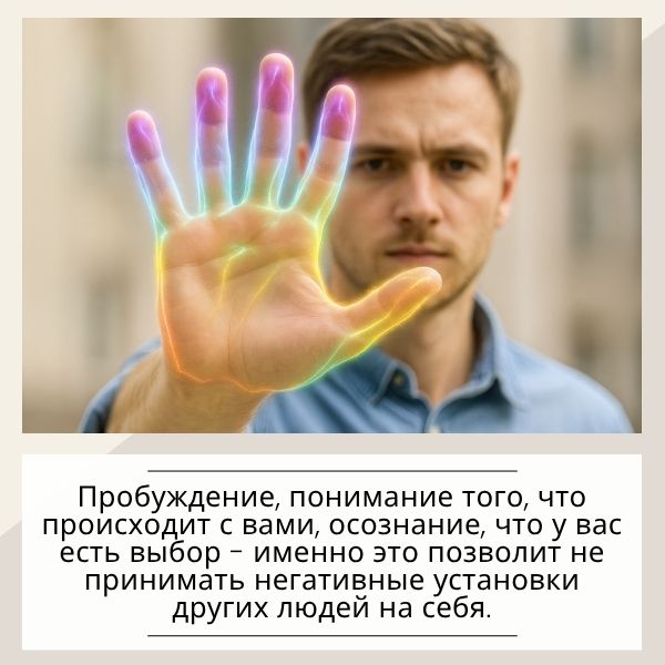 Итак, пробуждение, понимание того, что происходит с вами, осознание, что у вас есть выбор - именно это позволит вам не принимать негативные установки других людей на себя.