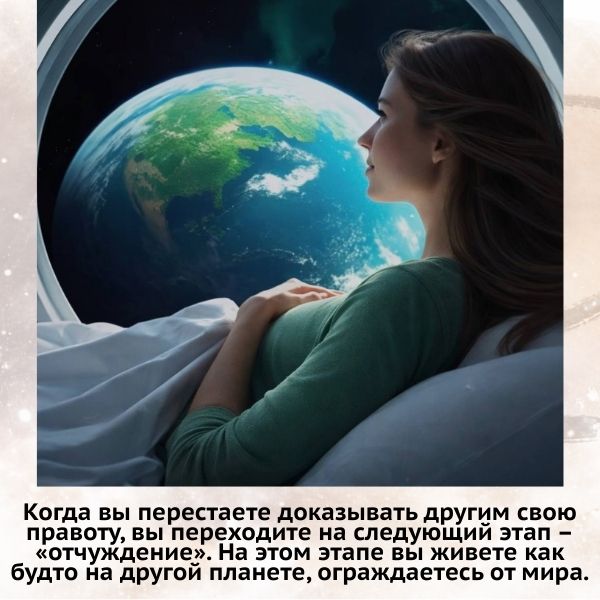 На этом этапе ценно повернуться к себе и заняться собой, своей собственной реальностью. Когда вы перестаете доказывать другим свою правоту, вы переходите на следующий этап – «отчуждение». На этом этапе вы живете как будто на другой планете, ограждаетесь от мира, уходите в себя. Вам кажется, что раз вы соприкоснулись с тайной, то вы лучше других людей. У вас появляется ощущение избранности. При этом вы видите, что окружающий мир далек от идеала, вокруг вас столько некрасивого, несправедливого...