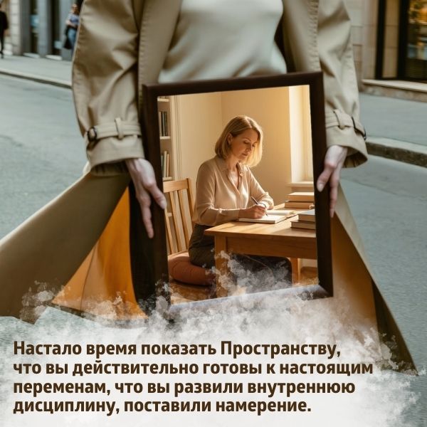 Настало время показать Пространству, что вы действительно готовы к настоящим переменам, что вы развили внутреннюю дисциплину, поставили намерение, а теперь легко и уверенно движетесь к результатам, как спортсмен – чемпион мира. Вы не заставляете себя, вы никому ничего не должны, вы действуете в полном согласии Души и Разума, вы абсолютно свободны! И тогда, именно в таком состоянии вы получаете всё, что хотите.
