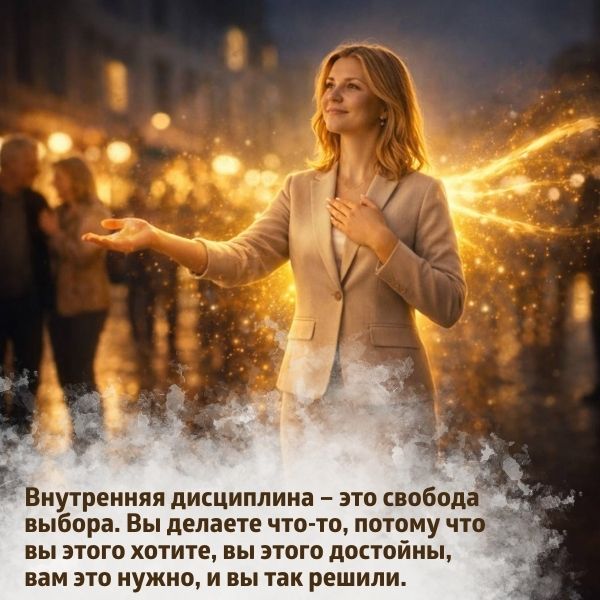 Внутренняя дисциплина – это свобода выбора. Вы делаете что-то, потому что вы этого хотите, вы этого достойны, вам это нужно, и вы так решили. А не потому что «так надо, приходится, заставляют». Приведём простой пример. Вспомните, с какой неохотой учились в школе некоторые ваши одноклассники (а может быть, и вы сами) – особенно те, кого больше всего принуждали к этому родители. А теперь перенеситесь обратно в настоящее и представьте: вот вы пошли на интересные курсы, изучать то, чего хочется именно вам (не вашим родителям, не вашему начальнику). Разве нужна вам будет дополнительная мотивация? Это и есть внутренняя дисциплина и настоящая свобода, путь к скорейшей реализации намерения и достижения результата!