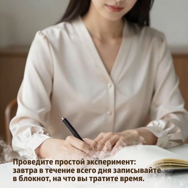 Проведите простой эксперимент: завтра в течение всего дня записывайте в блокнот, на что вы тратите время. Постарайтесь фиксировать каждое событие буквально по минутам: завтрак – 15 минут, дорога на работу – 40 минут, обеденный перерыв – 1 час... Представьте, что минуты – это ваша валюта, которую вам необходимо сосчитать.