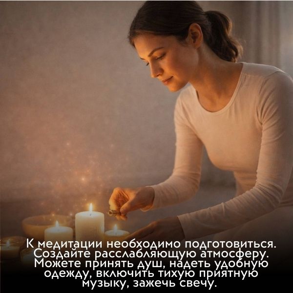 2. К медитации необходимо подготовиться. Создайте расслабляющую атмосферу. Можете принять душ, надеть удобную одежду, включить тихую приятную музыку, зажечь свечу.