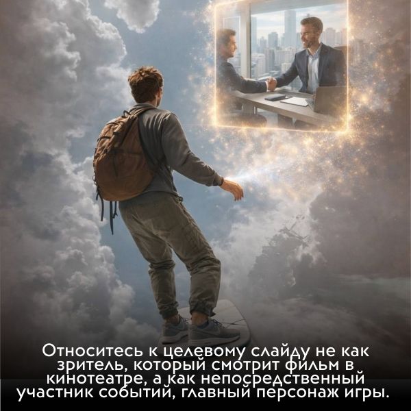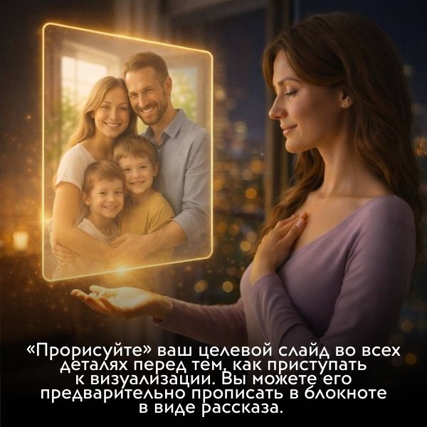 2. Начните мысленно погружаться в ваш целевой слайд. Представляйте себя в вашей желаемой картине мира. Прочувствуйте эмоции, ощущения, даже запахи. Вы должны быть главным действующем лицом и видеть то, что вы хотите, от первого лица.