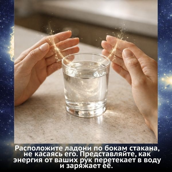 4. Зарядите энергией воду. Расположите ладони по бокам стакана, не касаясь его. Представляйте, как энергия от ваших рук перетекает в воду и заряжает её.
