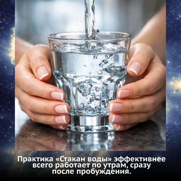 Практика «Стакан воды» эффективнее всего работает по утрам, сразу после пробуждения. Она занимает всего 5 минут. Все, что вам нужно – это стакан чистой «живой» воды и листок с записанной на нём амальгамой. Амальгама – это позитивная мыслеформа, установка на желаемое или, может быть, краткая версия вашего намерения.