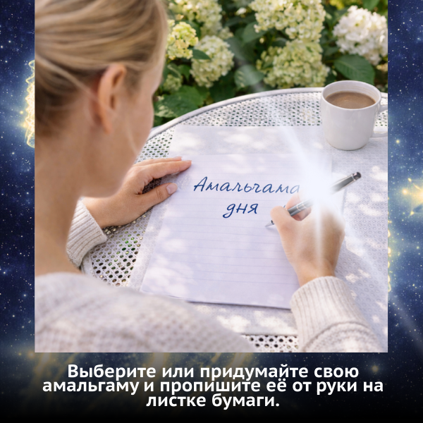 1. Запишите амальгаму. Выберите или придумайте свою амальгаму и пропишите её от руки на листке бумаги. Правила её формулировки такие же, как у намерения: в настоящем времени, без частицы «не», кратко и ёмко.