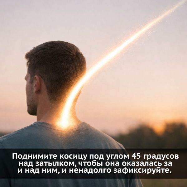 Поднимите косицу под углом 45 градусов над затылком, чтобы она оказалась за и над ним, и ненадолго зафиксируйте. Затем сбросьте это ощущение. У вас должно получится.