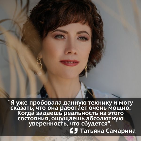 "Я уже пробовала данную технику и могу сказать, что она работает очень мощно. Когда задаешь реальность из этого состояния, ощущаешь абсолютную уверенность, что сбудется. Более того, я поэкспериментировала - соединила две стрелки от затылка и лопаток в точке Духа, и состояние Присутствия усилилось. Как будто меня приподнимают вверх, тело вытягивается и вибрации усиливаются в верхней части тела и головы. Ощущение, что взлетаю, как на парашюте. Появилось мощное состояние собранности, спокойствия и Силы". (Татьяна Самарина)