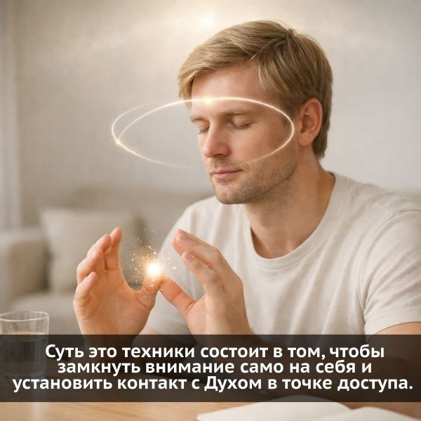 Суть этой техники состоит в том, чтобы замкнуть внимание само на себя и установить контакт с Духом в точке доступа. Алгоритм ее выполнения вы можете найти на сайте Вадима Зеланда zelands.ru в разделе «Новые техники Тафти». Представляем его и здесь: