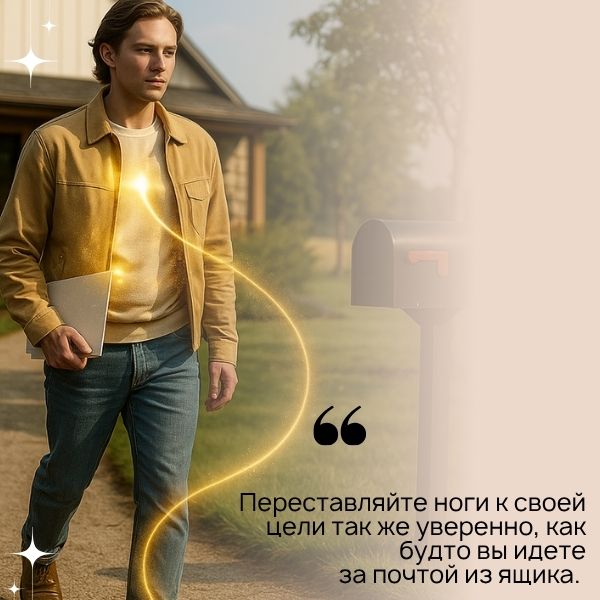 Переставляйте ноги к своей цели так же уверенно, легко и непринужденно, как будто вы идете за почтой из ящика. Не завышайте важность и не сомневайтесь. Не готовьтесь к борьбе с почтальоном или к взлому почтового ящика. Просто идите и возьмите свое, открыв дверцу ключом. Перестаньте думать о почте как о проблеме, просто действуйте, параллельно выполняя техники Трансерфинга и Тафти.